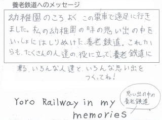 | 4年生 | かぞくとはじめて養老鉄道にのったときはちいさいとき くわしくはおぼえていないけど、楽しかったとはおぼえています。 |